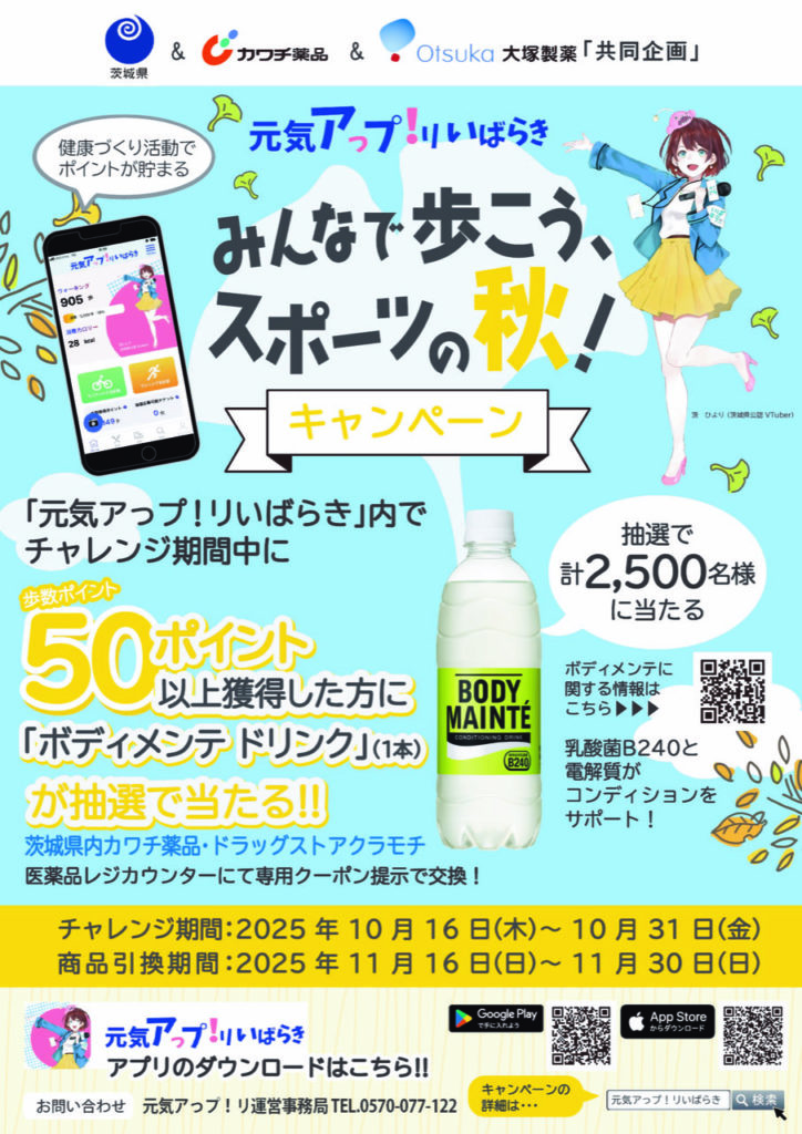 10月16日(木)から10月31日(金)までのチャレンジ期間中に、歩数ポイントを50ポイント以上獲得した方2,500名様に、「ボディメンテドリンク」(1本)が抽選で当たります!!